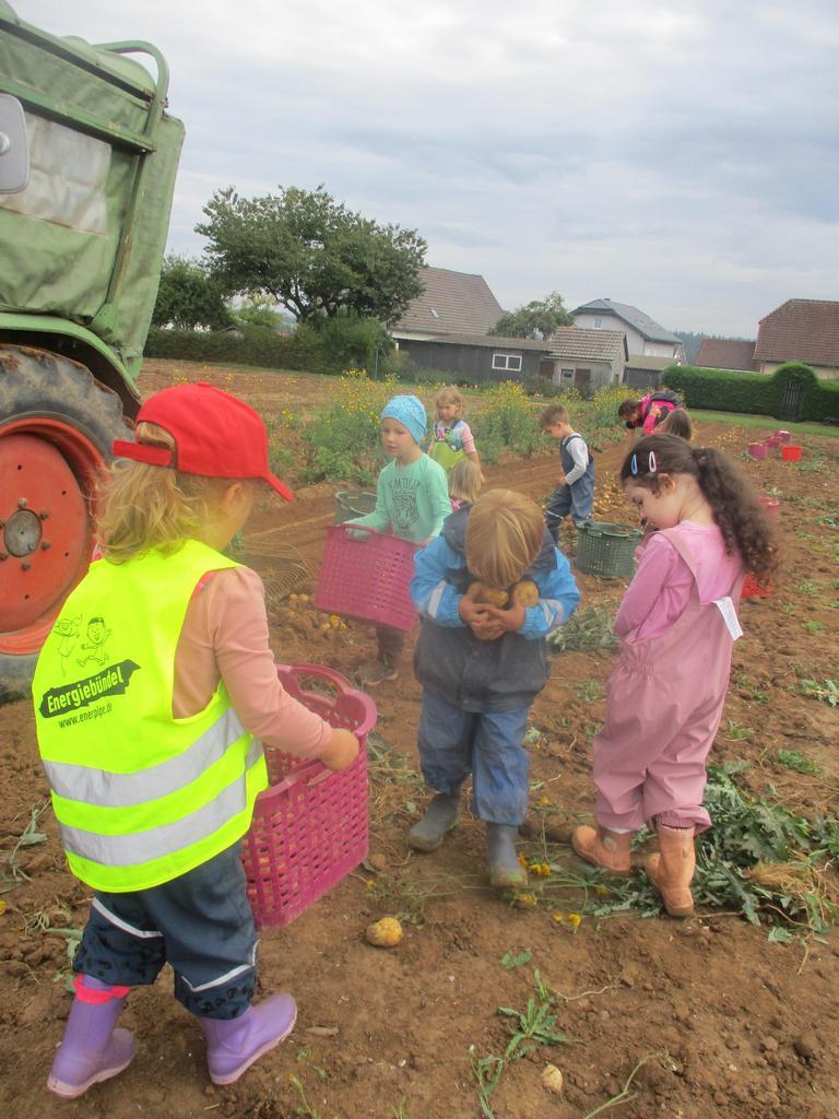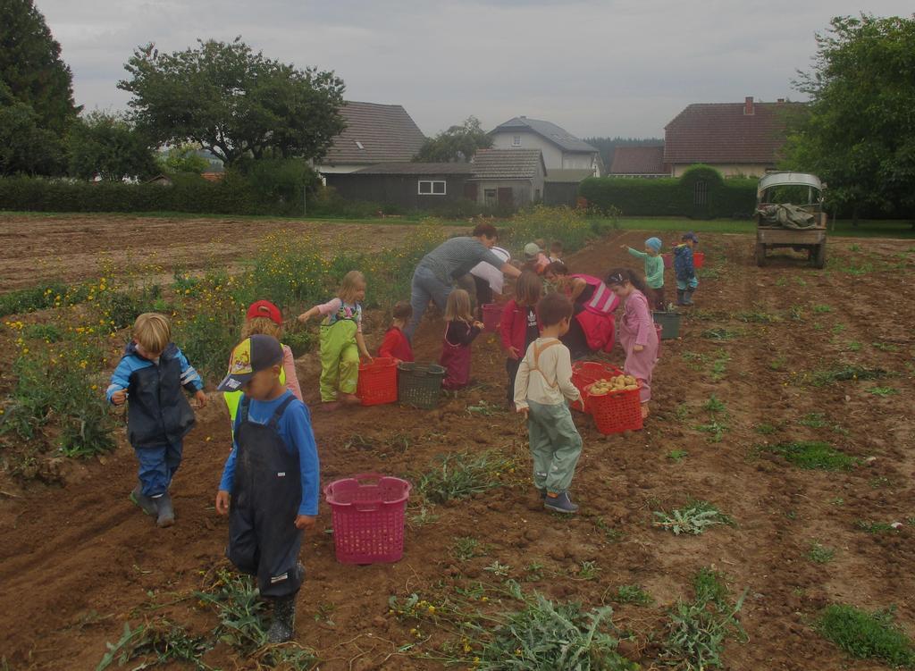 Nach unserer Ankunft wurden die Kartoffeln mithilfe eines Traktors und eines speziellen Kartoffelernters aus der Erde geholt. Anschließend konnten die Kinder eigenständig die Kartoffeln aufsammeln und in Körbe füllen. Mit großer Begeisterung und viel Eifer machten sie sich ans Werk – und spätestens an den schmutzigen Händen und Schuhen konnte man erkennen, dass alle mit Freude bei der Sache waren.