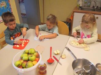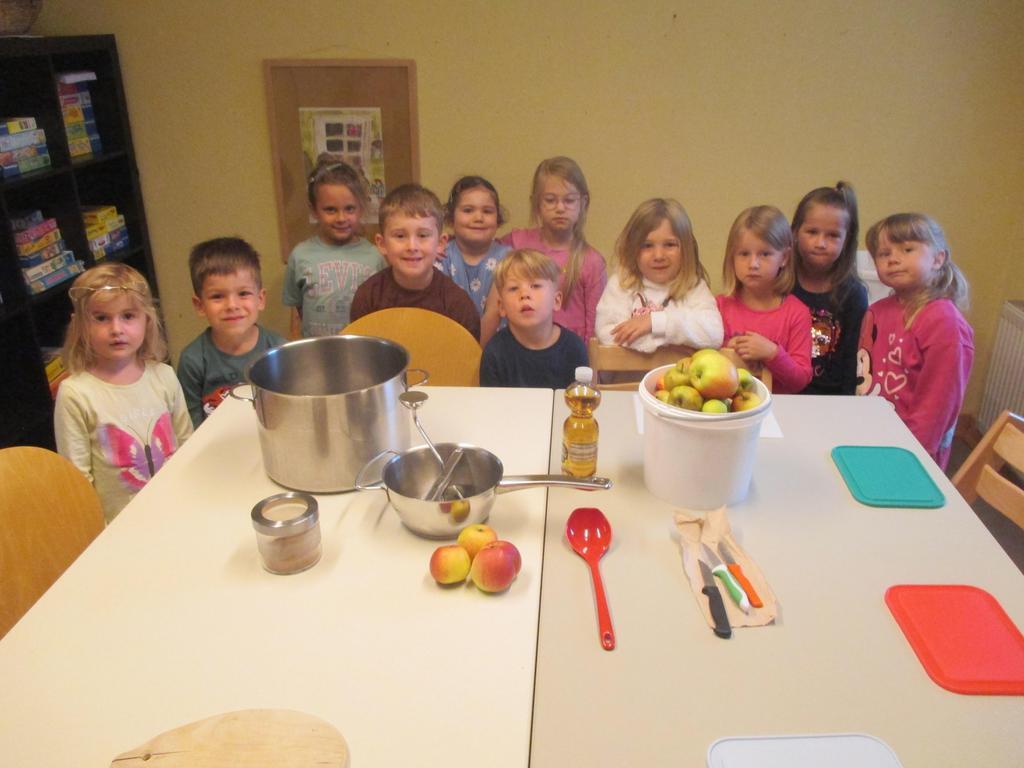Die Apfelbäume auf dem Kita-Gelände trugen reichlich Äpfel. Schon seit einiger Zeit wurde über die Entstehung, das Werden des Apfels gesprochen. Als sie reif waren, haben wir die Äpfel aufgesammelt und dann gemeinsam in einer Kleingruppe daraus Apfelmus gekocht.