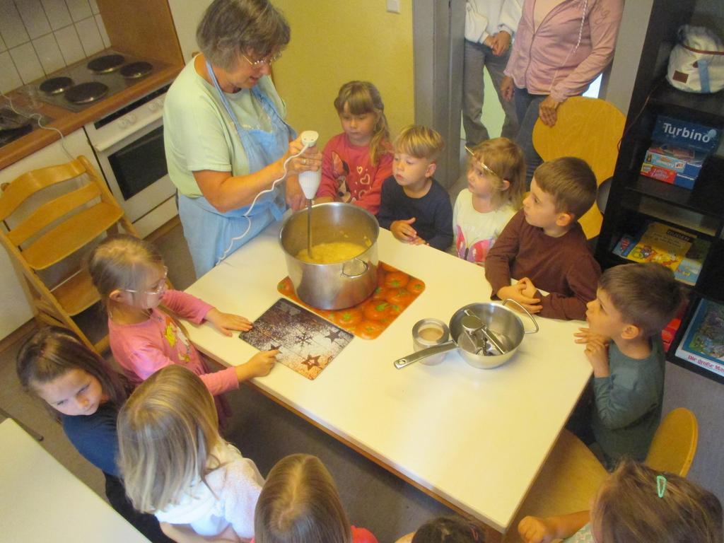 Zunächst wurden die einzelnen Arbeitsschritte besprochen, dann ging es los mit der Arbeit: Äpfel schälen, in kleine Stücke schneiden, alles in einen großen Kochtopf geben und etwas Apfelsaft dazu. Dies alles wurde zum Kochen gebracht und abschließend mit dem Stabmixer püriert. Als das Apfelmus abgekühlt war, konnten die Kinder es als Nachtisch zum Mittagessen essen.