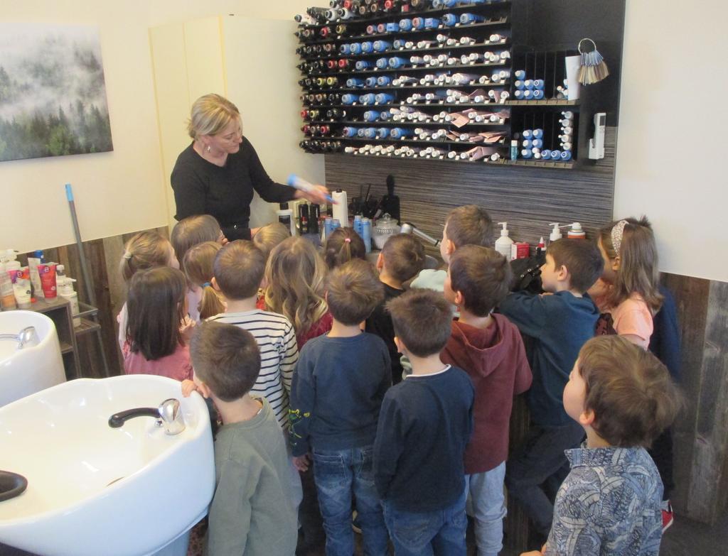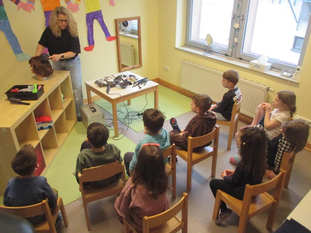 Sie brachte zahlreiche Utensilien mit, darunter Kämme, Scheren, einen Föhn, ein Glätteisen und Lockenwickler. Anschaulich erklärte sie uns, welche Aufgaben eine Friseurin übernimmt: Haare schneiden, färben oder Strähnchen setzen, Haare glätten oder Locken formen und vieles mehr. Besonders aufregend war, dass wir uns selbst an einem Haarmodell ausprobieren durften. Simone zeigte uns geduldig, wie man Haare schneidet oder Lockenwickler richtig eindreht. Das war für alle Kinder sehr interessant und spannend.